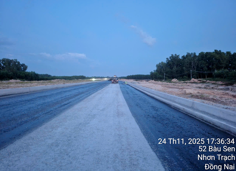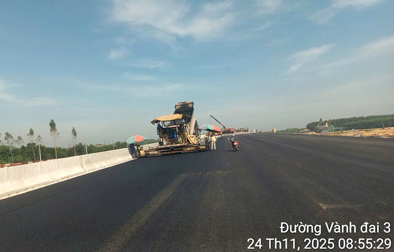 Hiện tại, tranh thủ thời tiết thuận lợi, công tác thảm bê tông nhựa đang được triển khai đồng loạt trên toàn tuyến. Đây là giai đoạn then chốt quyết định đến chất lượng vận hành và tuổi thọ của công trình sau này.